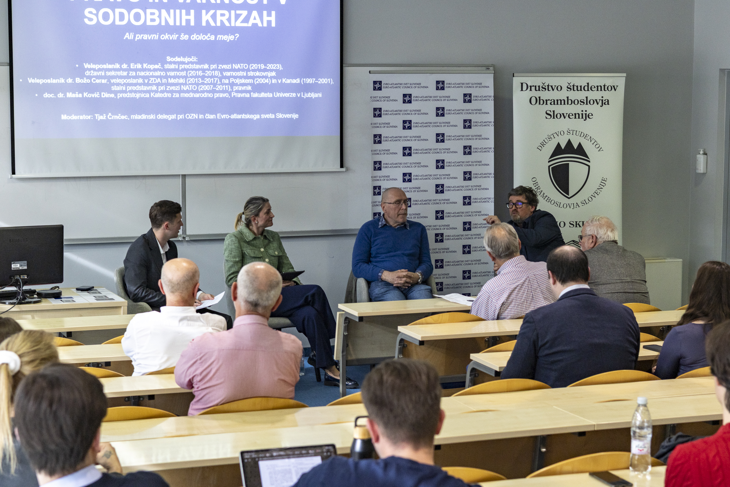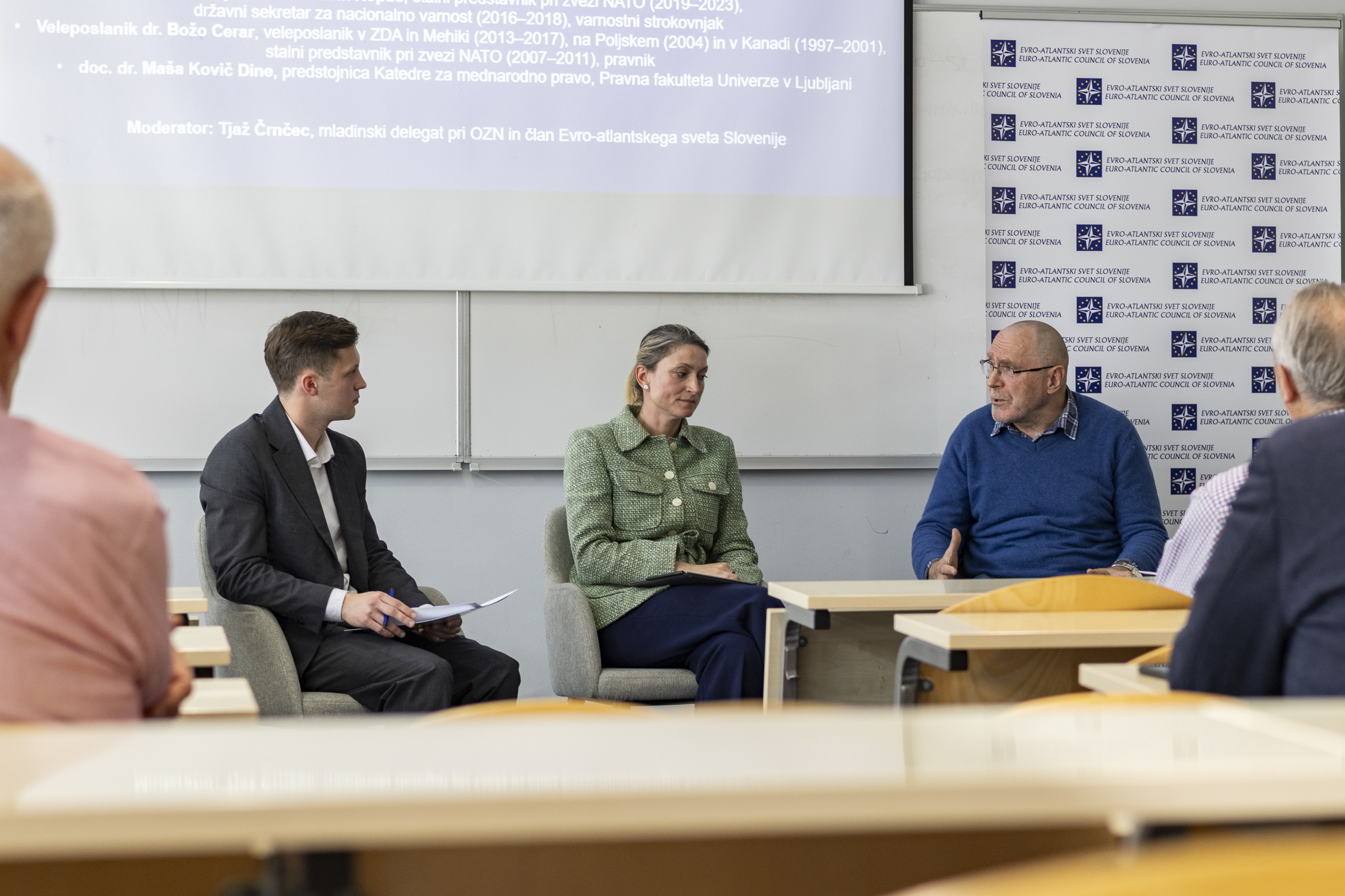 The panel featured Ambassador Dr Erik Kopač, Ambassador Dr Božo Cerar, and Assistant Professor Dr Maša Kovič Dine. The discussion was moderated by Tjaž Črnčec, Slovenia’s Youth Delegate to the United Nations and a member of the Euro-Atlantic Council of Slovenia. Opening remarks were delivered by Brin Najžer, PhD, Vice President of the Euro-Atlantic Council of Slovenia.