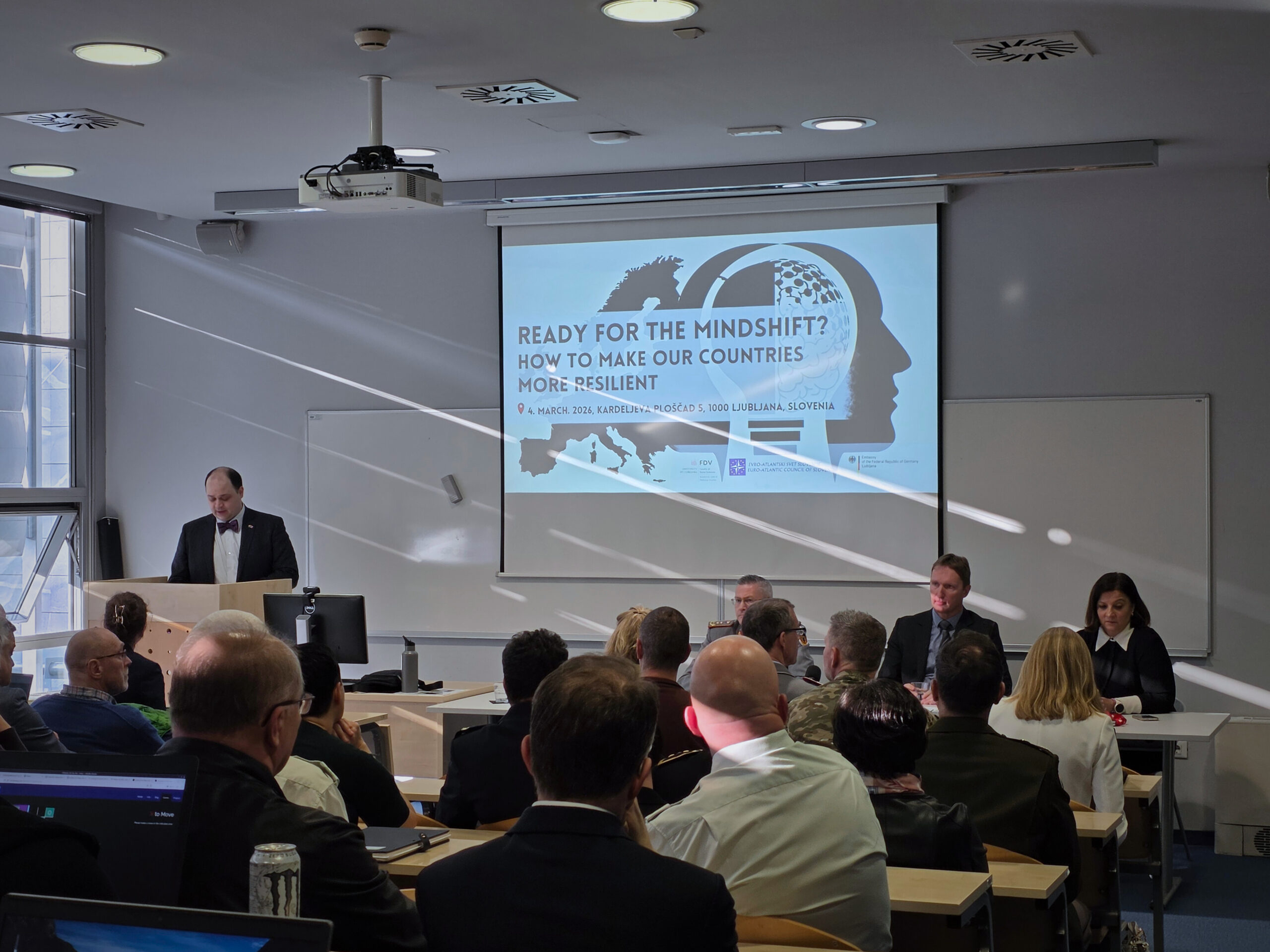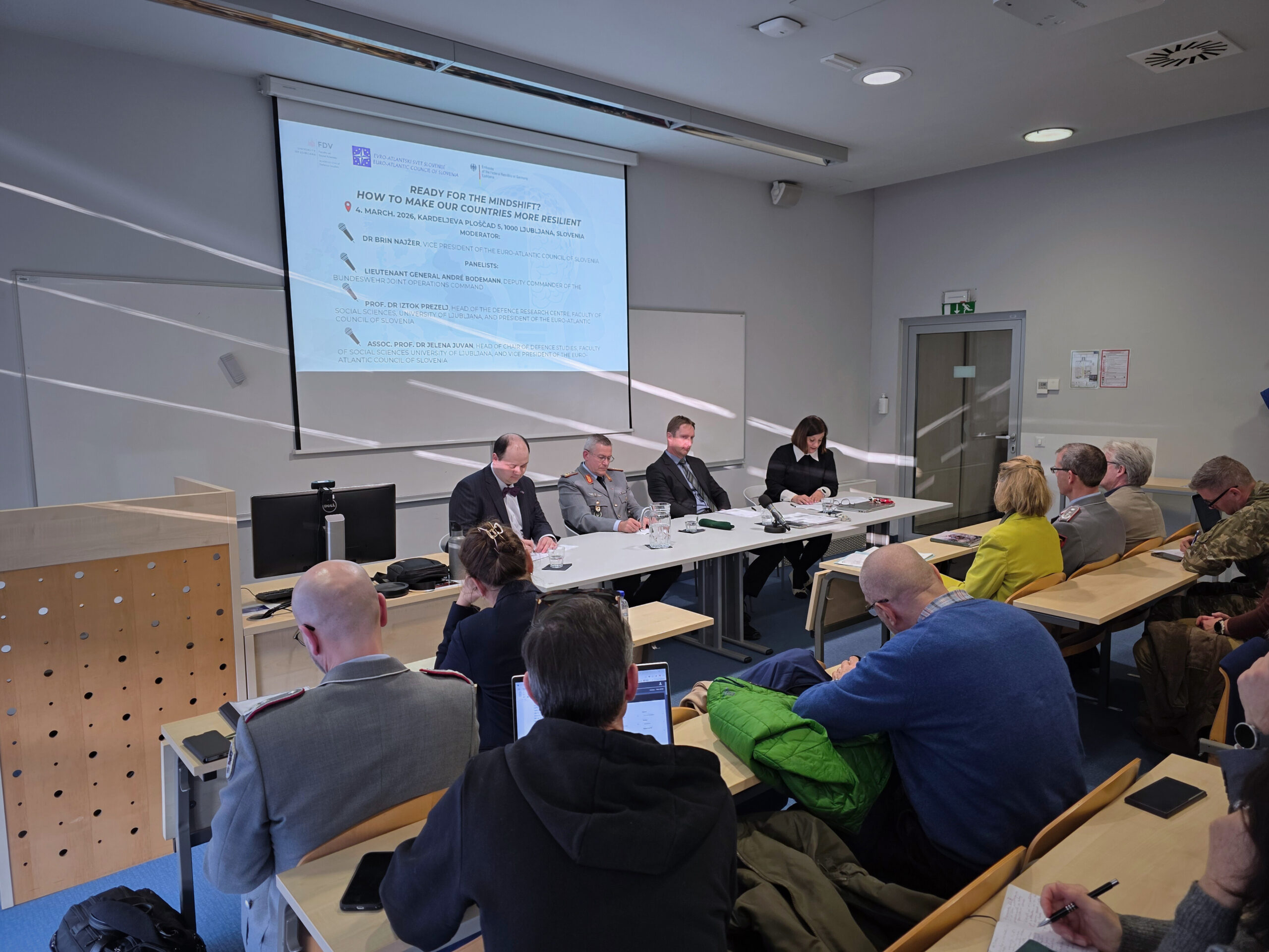 On 4 March 2026, the Faculty of Social Sciences at the University of Ljubljana (FDV UL) hosted an international panel discussion titled “Ready for the Mindshift? How to Make Our Countries More Resilient.” The event was organised by the Euro-Atlantic Council of Slovenia, the Chair of Defence Studies, and the Embassy of the Federal Republic of Germany.